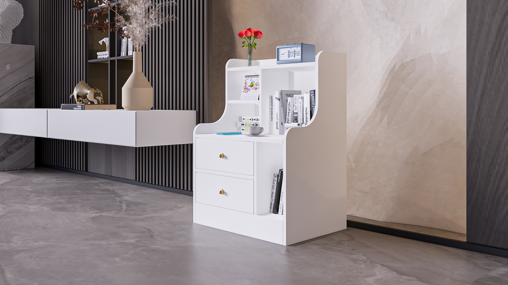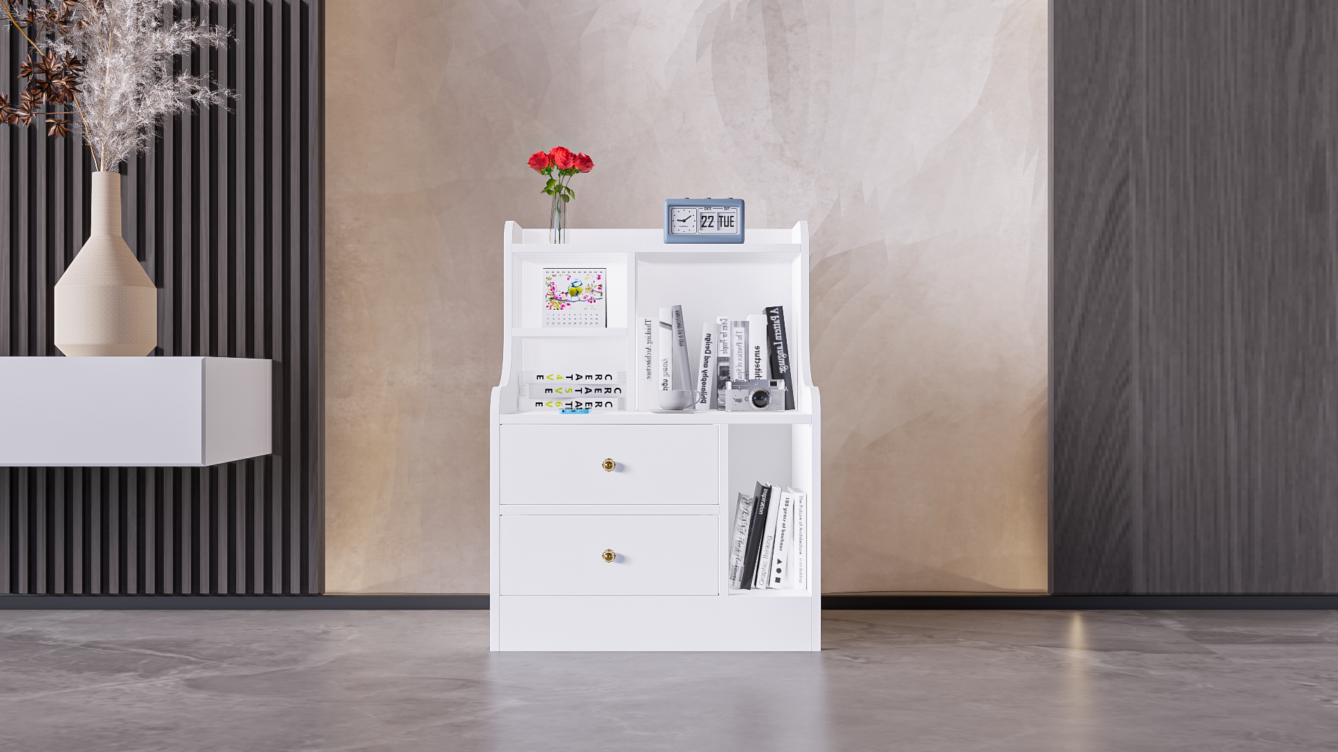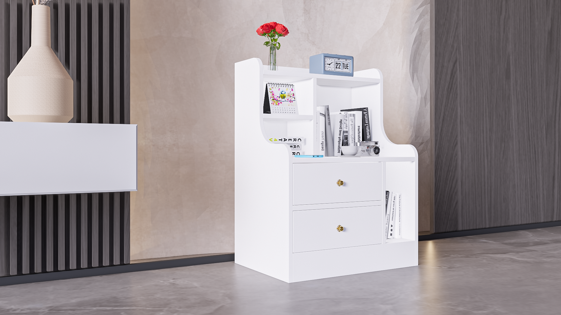 Mô Tả Sản Phẩm: Tab đầu giường nhiều ngăn giúp tối ưu tối đa các không gian nhỏ.