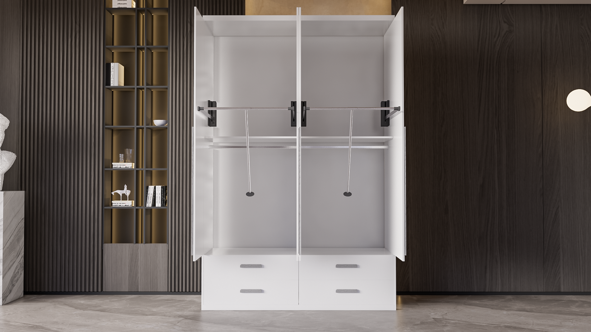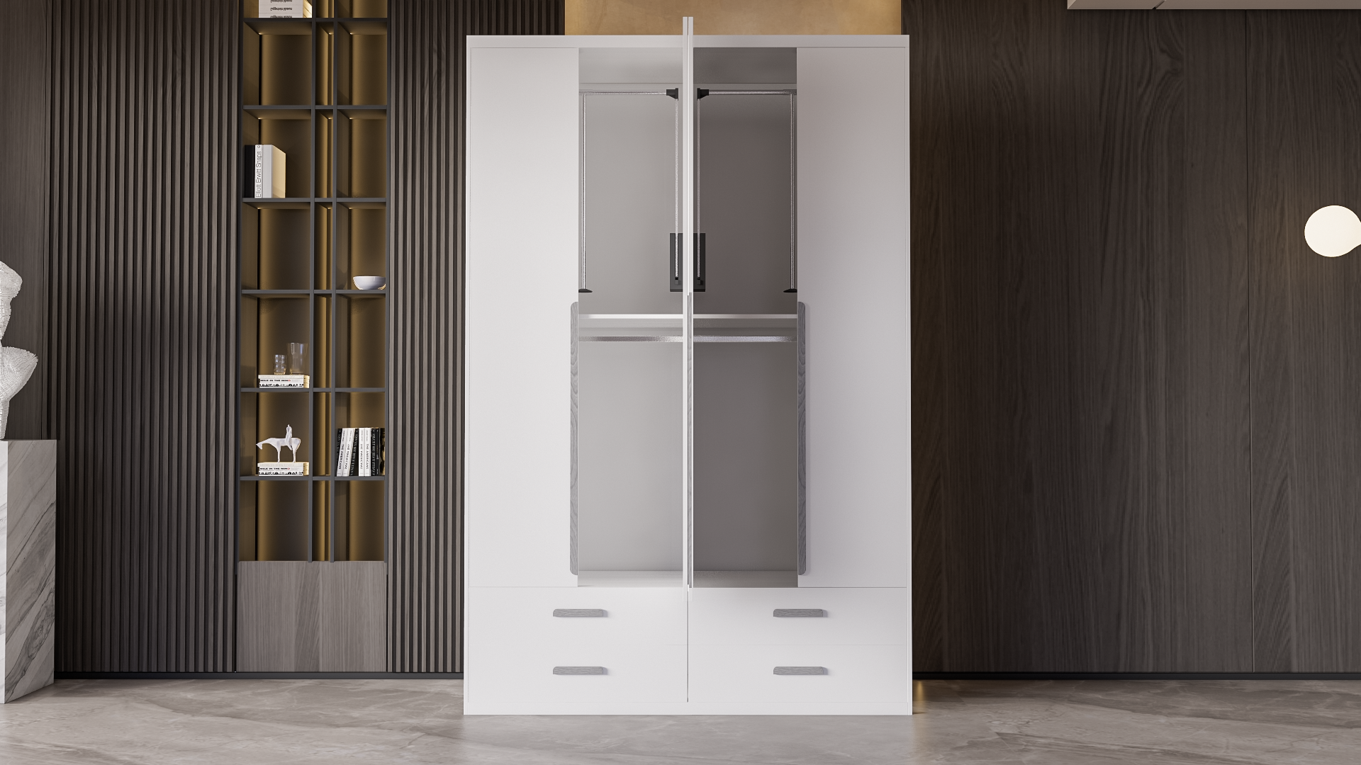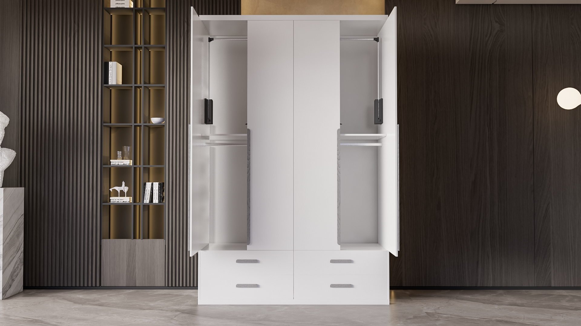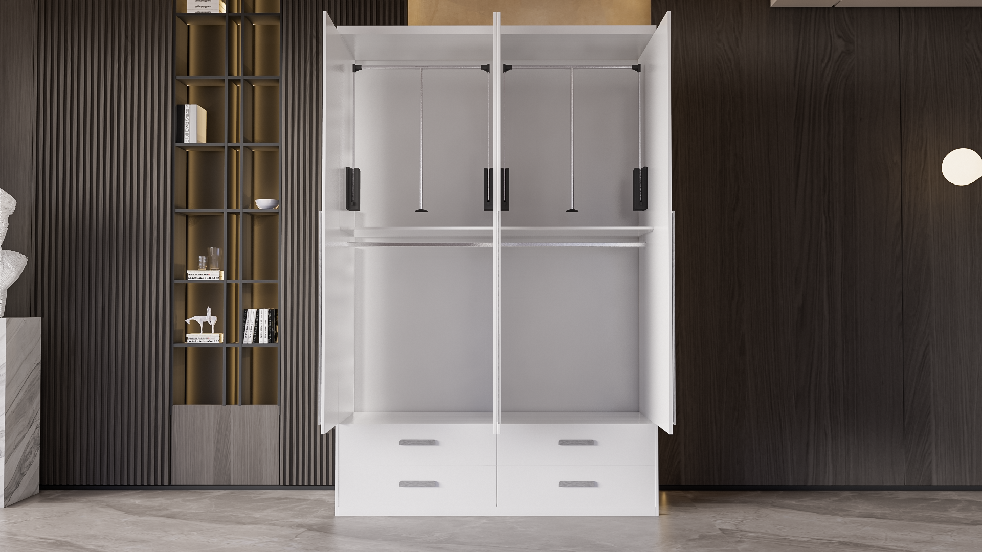 Mô Tả Sản Phẩm: Tủ quần áo được thiết kế kéo tay nâng hạ để thuận tiện cho việc lấy quần cũng như sắp xếp quần áo.